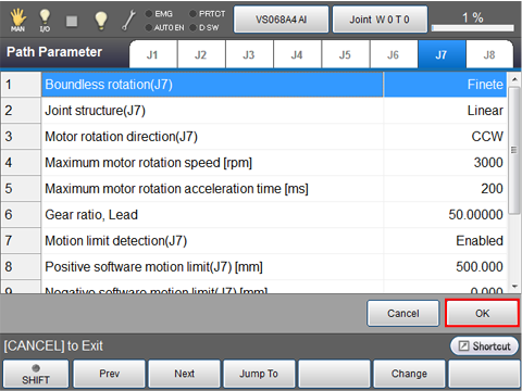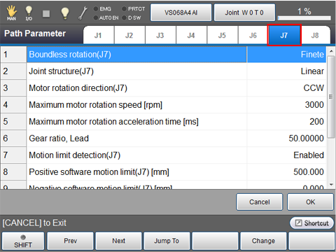 In this setting, path parameters, which are provided for motion definitions (including speed, acceleration, and range of motion) of extended-joints are configured.