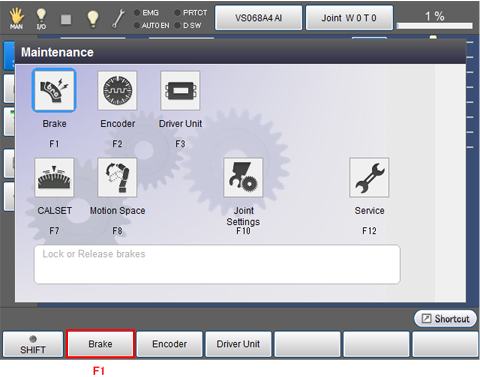 Display the Maintenance window in the way of STEP1. Then following STEP2, changes the joint whose brake is released from "Free" to "Lock", then press [OK] key of the teach pendant.