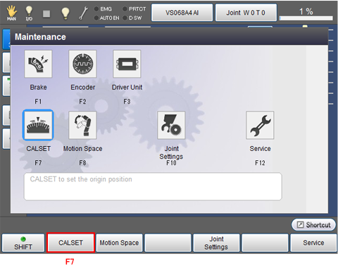 Press Top Screen — [F2 Arm] — [F12 Maintenance] — [F7 CALSET]
