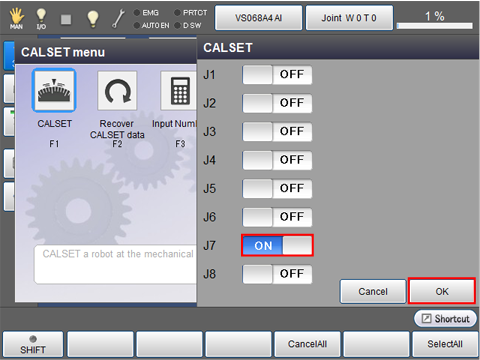 Select the extended-joint to perform CALSET and then press [OK]. The indicator of the selected button turns into "ON".