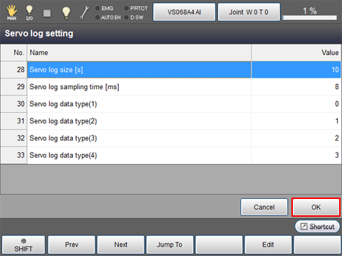 Change each setting of the servo logging configuration parameters, then press [OK].
