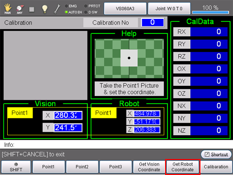 Use the camera to take an image of point 1 and read the coordinates. Enter the read coordinates in the following procedure.
