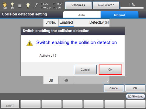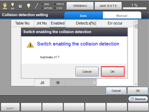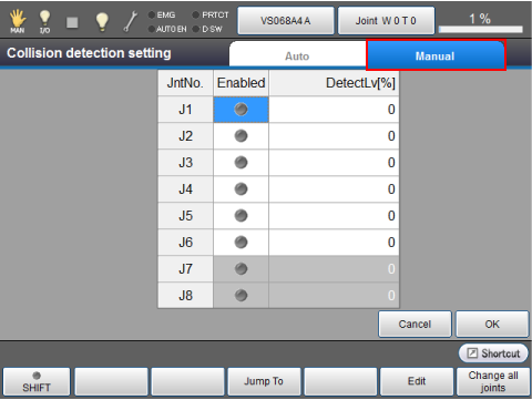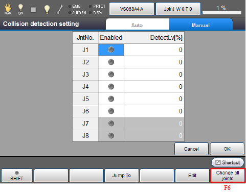Select the axis numbers that you want to enable the collision detection function and press [F6 Change all joints].