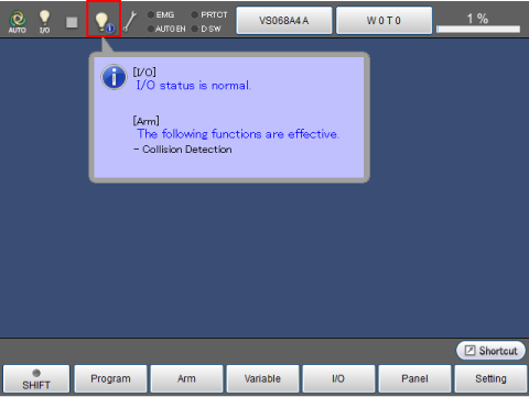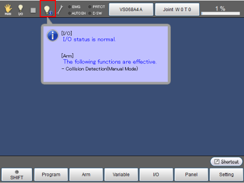 To check the collision detection enable/disable status, press the arm status icon on the top of the window.