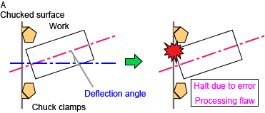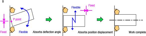 Enabling Compliance Function in the above cases will absorb any position displacement, and thus prevent errors and damage that may arise (refer to B below).