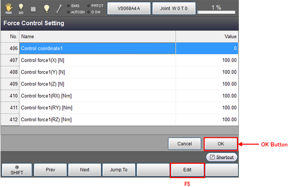 From the top screen, press [F2 Arm] - [F2 Force Control].