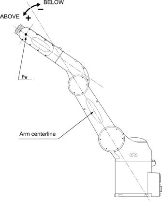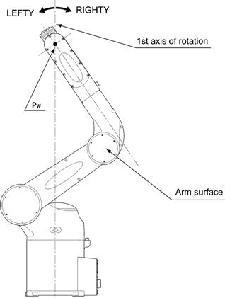 When viewed from the normal line on the side of the arm link, if point Pw exists in the left-hand side of the rotary axis of the 1st axis, the figure is LEFTY; if point Pw exists in the right-hand side, it is RIGHTY. In the figure shown below, the boundary is drawn with alternate long and short dash lines.