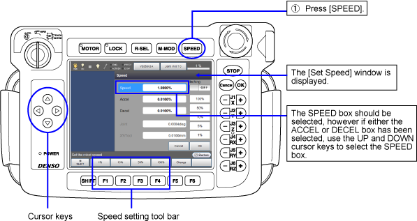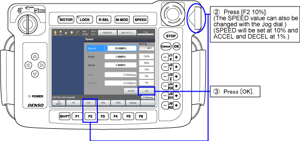 At the beginning, leave these settings as they are, as you will be running the robot slowly to ensure safety. The settings can be changed later on, after you have become accustomed to running the robot with the teach pendant.