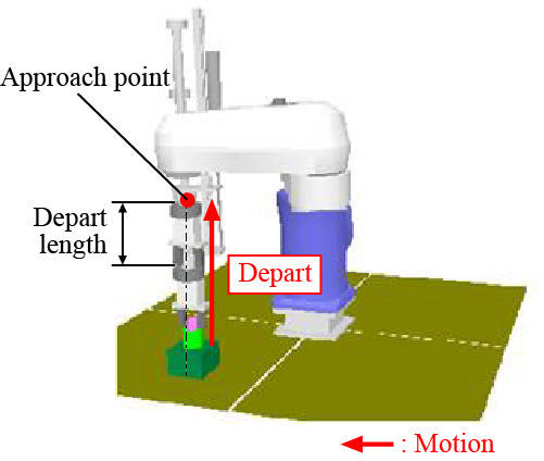 Since it is difficult to figure out the depart and approach positions manually, Approach command and Depart command are prepared to calculate these positions automatically.