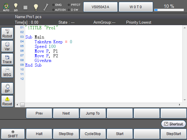 Executing the cycle stop stops the robot after executing the last step of the task program. This is used when the robot is continuously started.