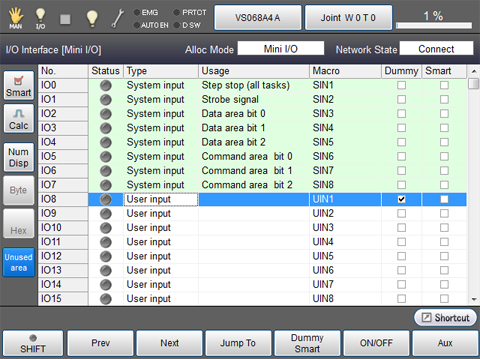 You can monitor the status of system inputs and outputs, user inputs and outputs, and internal I/O in real time. Also, you can simulate robot motions by forcibly turning on the user output signal, hand output signal, and internal I/O signal, or by turning on the dummy signals of user inputs and hand inputs.