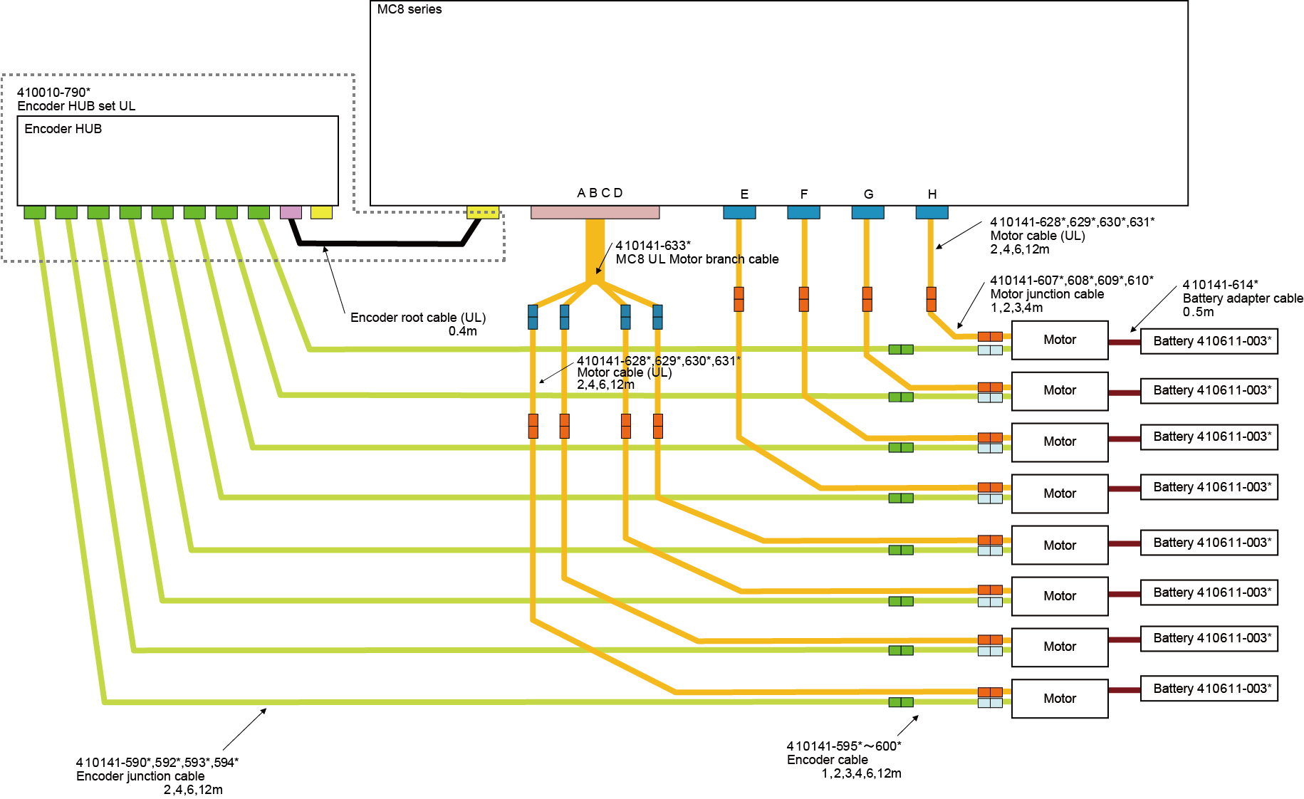 Connect motor cables with motor connectors on the MC8 series directly, as shown below. Encoder cables are connected to the MC8 series through the encoder HUB.