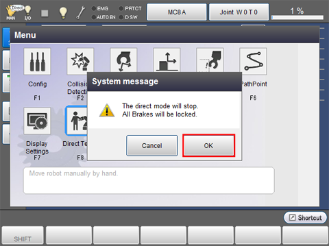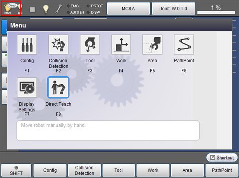 Once the icon of the teach pendant is displayed on the upper left of the screen, the direct mode starts.