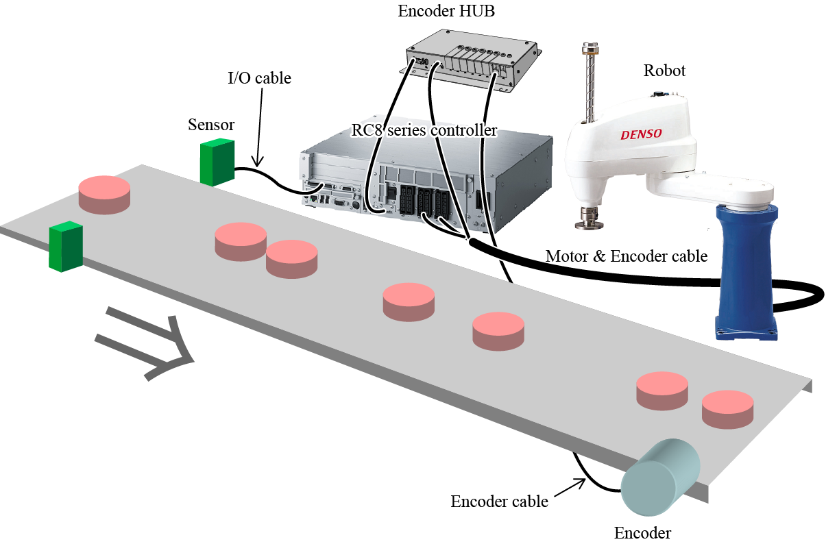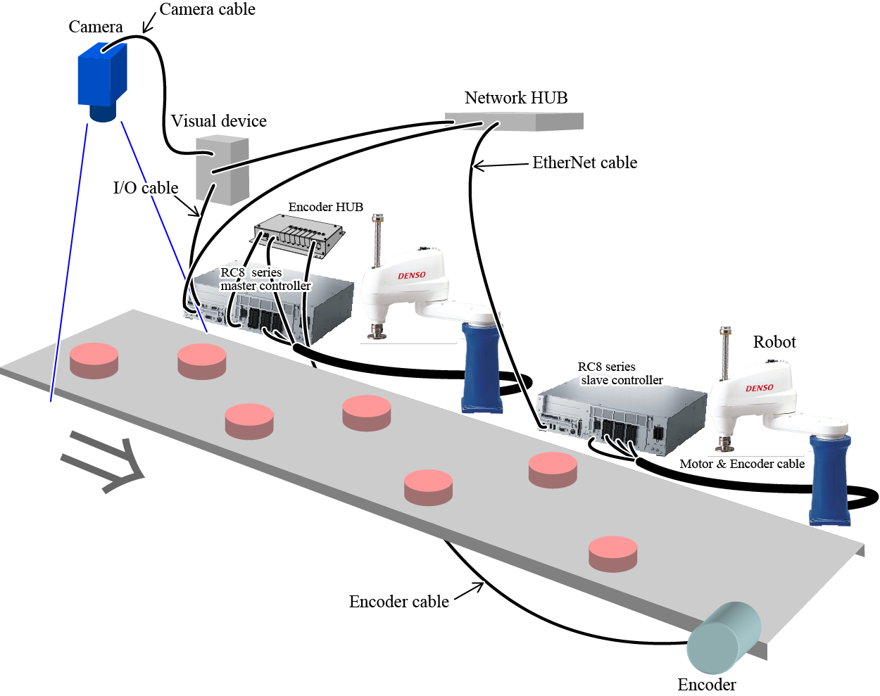 The difference between the conveyor tracking system and this system is the drive mechanism of the conveyor. The conveyor in this system is driven by the extended-joint. Other functions are the same as the conveyor tracking.