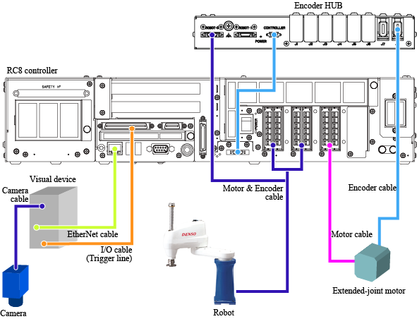 If you use a new model, connect the encoder line of the motor & encoder cable to the encoder hub's connector port indicated as "ROBOT-0" (on the left side viewed from the front).
