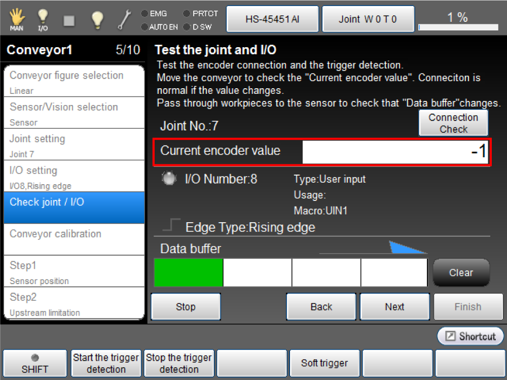Operate the conveyor then check whether the value of [Current encoder value] changes properly.