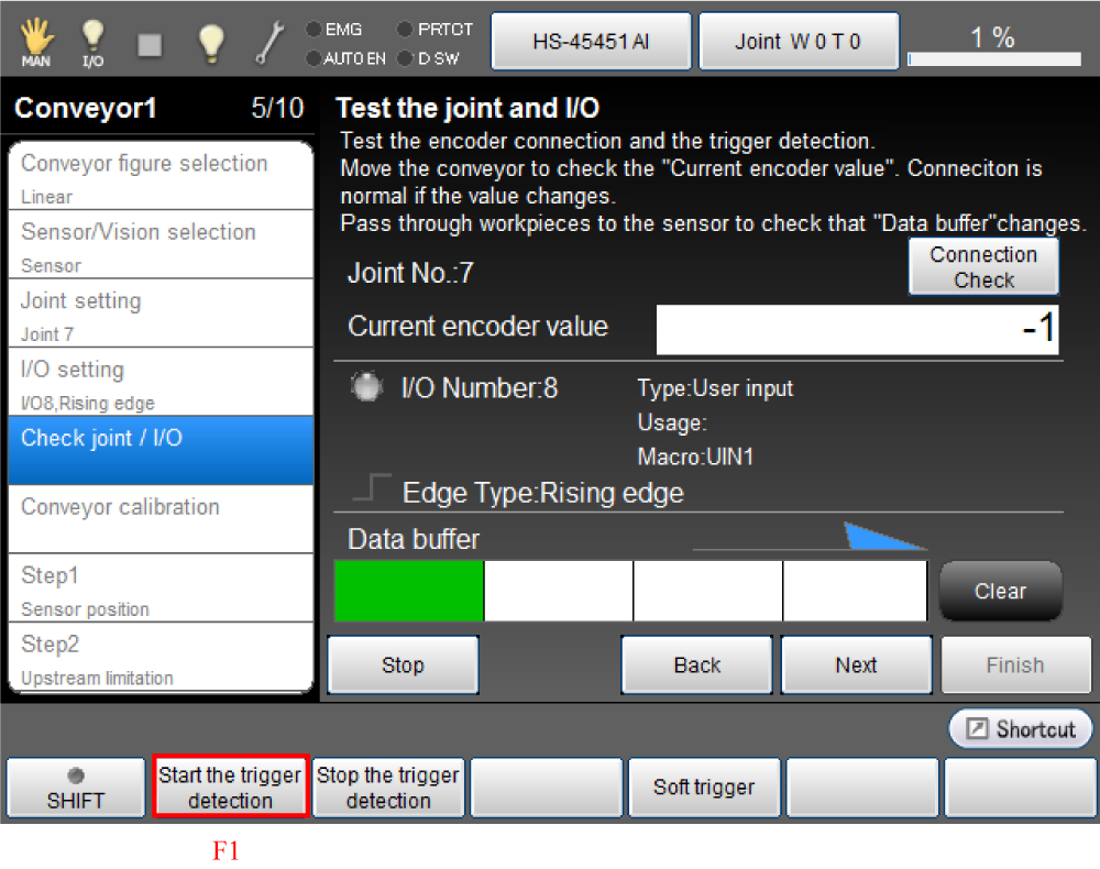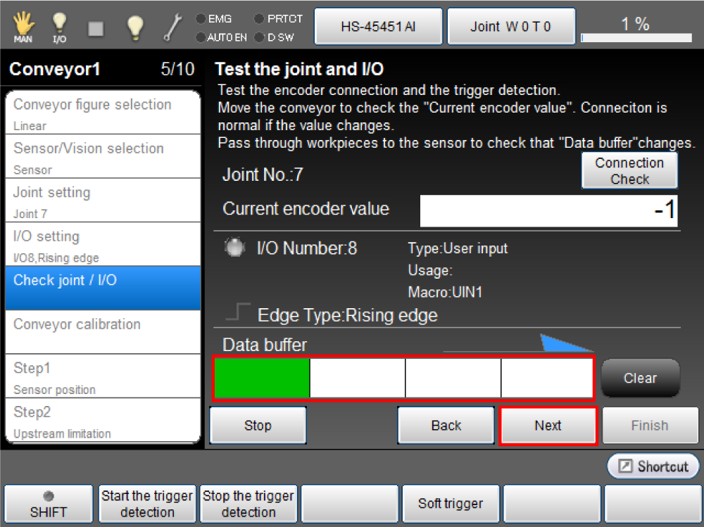 Place a work piece on the conveyor to pass through the sensor, and then check whether the value of the [Data buffer] changes properly.