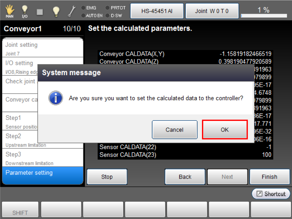 A system message is displayed to confirm whether to set the calculated data to the controller. Press [OK] if everything is satisfactory.