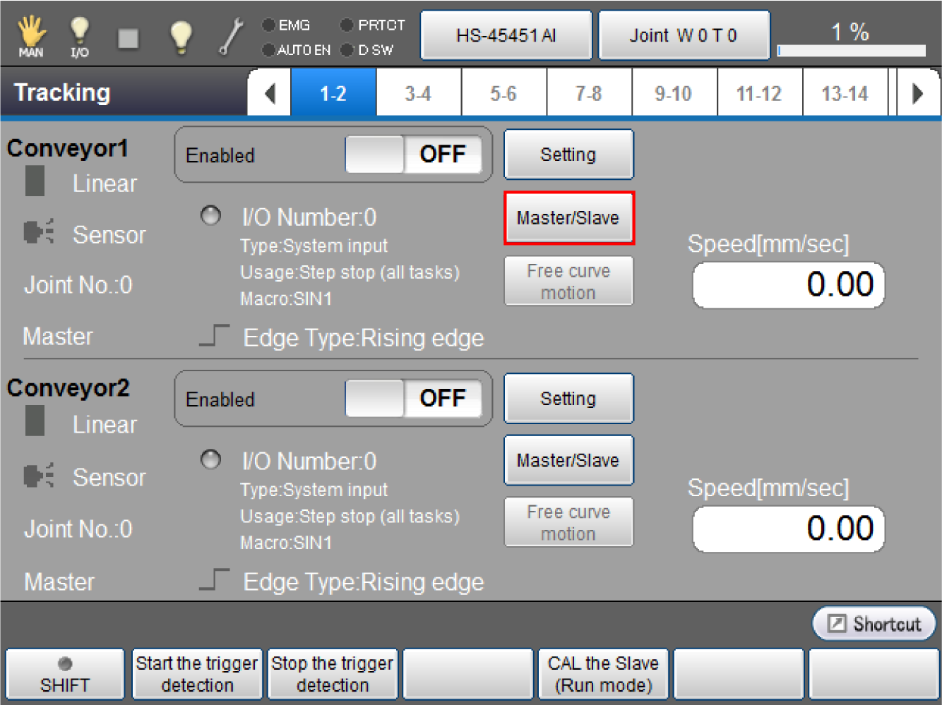 On the "Tracking" window, press "Master/Slave" for the conveyor which should be set as a slave.