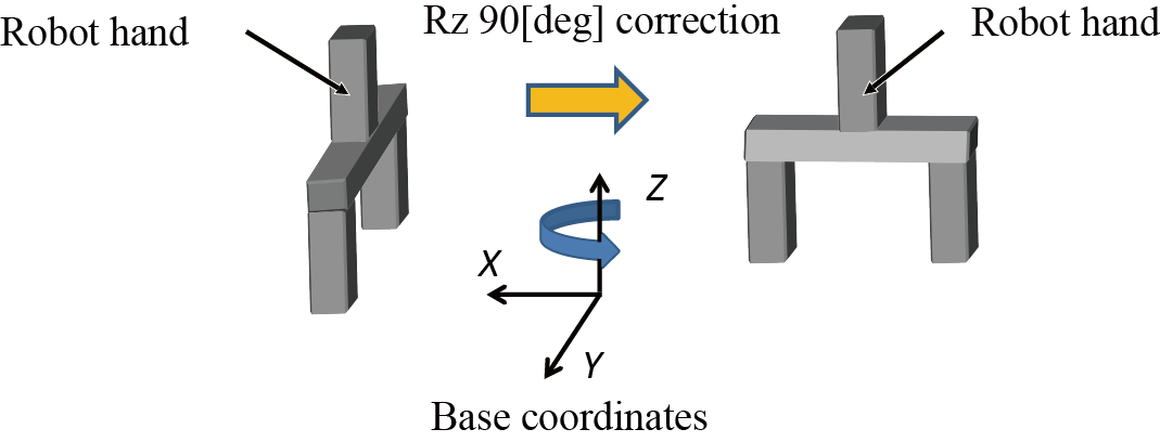 To correct the robot attitude depending on the workpiece direction detected by the vision sensor, as the following sample code shows, obtain the workpiece's attitude angle detected by the vision sensor by TrackBufferRead first, and then add correction values for each attitude element (Rx, Ry, and Rz) of the second argument [Target position].