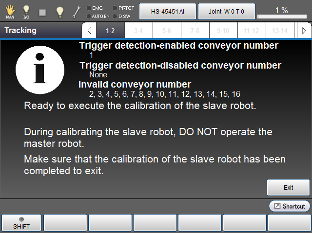 - For the calibration of the conveyor tracking/extended-joint tracking, perform in order of the master controller, the slave controller.