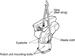 Pass the hoisting wires through the specified eyebolts as illustrated below. Passing them through other sections may drop the robot unit, resulting in a broken robot or bodily injuries.