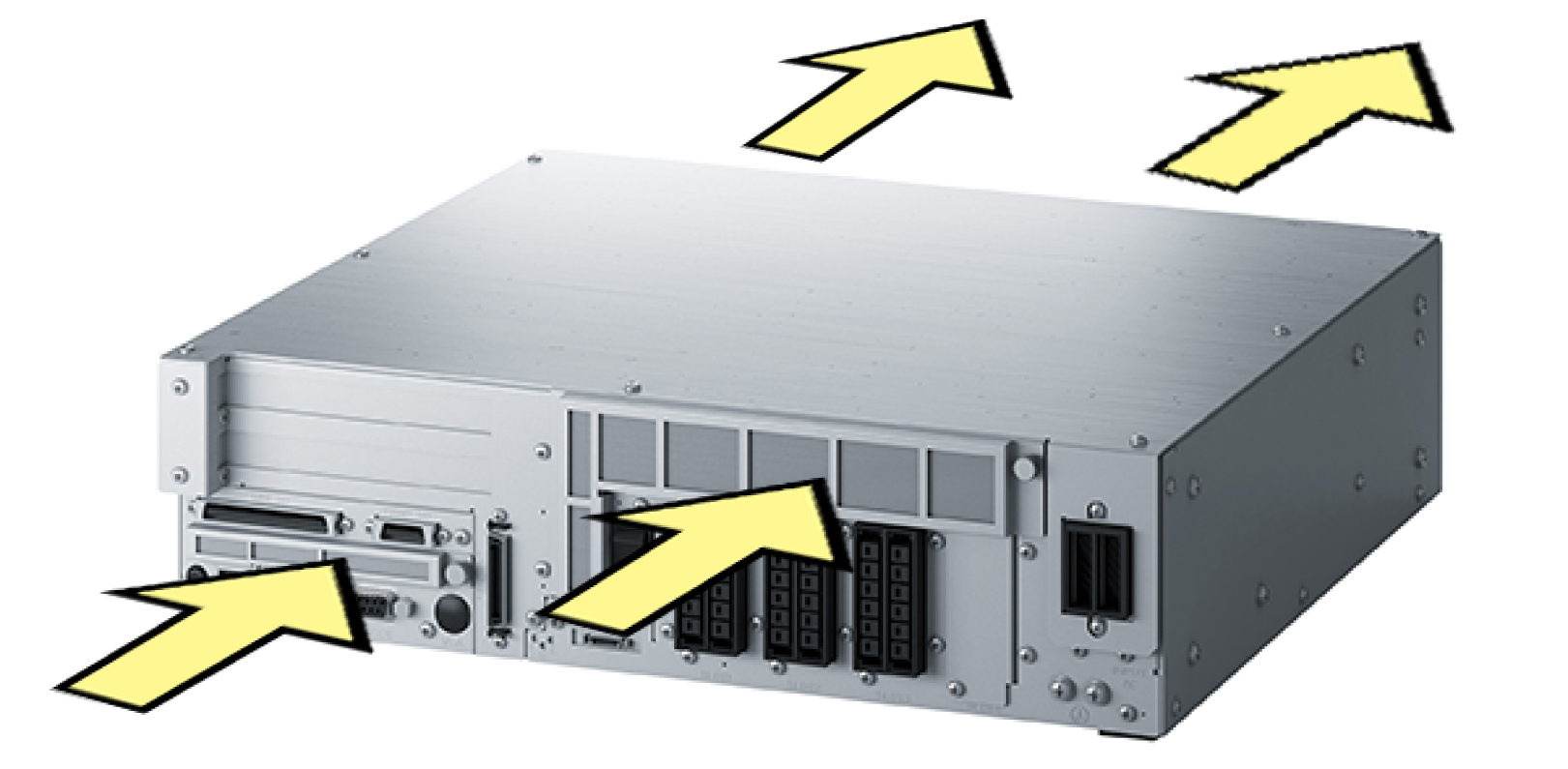 | Cooling fan in the robot controller | Hold up a hand to the exhaust port and check the wind is blowing off. | Should work properly. | Repair or replace. |