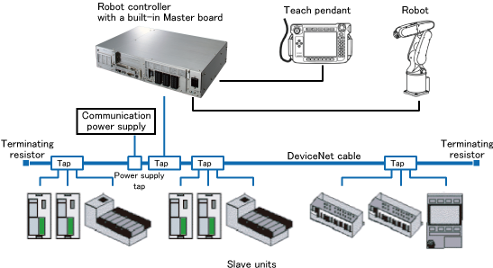 Connect the master board and slave devices with the DeviceNet dedicated cable in reference to the system configuration sample shown above. More details about configuration, see System Configuration and Configurators.