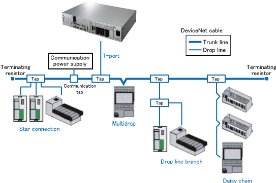 As shown below, a variety of connection styles are available for DeviceNet. They include multidrop, star connection, T-ports, daisy chain, and drop line branching.