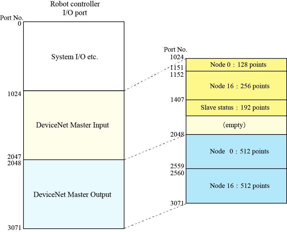 The following table shows the port number of DeviceNet master board. For about I/O areas of the robot controller, refer to I/O Port Map and Allocation.