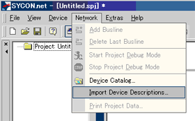 Start SYCON.net. On the main menu, in [Network] tab, click [Import Device Descriptions].