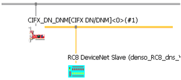 Master board CIFX DN/DNM, which has been set in STEP3, is displayed as shown below. From the tree in the right side of the display, click [DeviceNet]-[Slave] and then select desired slave device. Move the slave device to the horizontal yellow line on the center of the window, which comes from the master board icon, using a drag-and-drop operation.