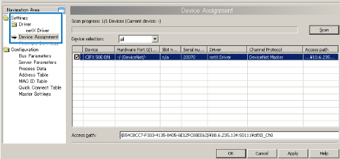 You can see [CIFX50E-DN] or [CIFX] on the display and check it. Click [OK]. If you cannot see [CIFX50E-DN] or [CIFX] on the display, choose [all] from Device selection and click [Scan].