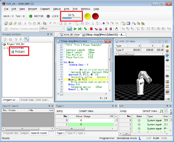 On the [Debug] menu, select [Start a Task] or [Step in] to execute the program.