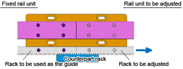 While referring to the fixed rack of the rail unit as a guide, use a counterpart rack to adjust the pitch with the rack to be adjusted.