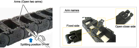 Split and reconnect a cableveyor where replacement is needed according to the procedure shown below.
