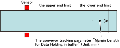 More precisely, even if a workpiece goes beyond the lower end limit, the workpiece data is not deleted until it goes beyond a certain range. The range is determined by "Margin Length for Data Holding in buffer", one of conveyor tracking parameters. The range is measured in "mm" with the initial value 0 mm.
