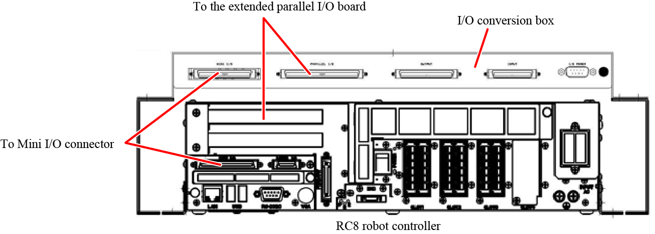 | I/O conversion box | The I/O conversion box shall be installed in apparatus with four screws across a RC8 robot controller. Connect this box to the RC8 robot controller with accompanying Mini I/O connection cable and Parallel I/O connection cable. |