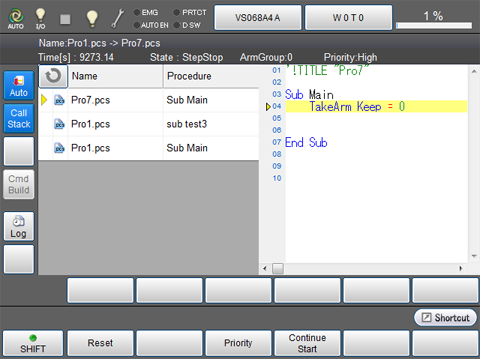 | Name | Display caller's file names (pcs, pns, or h file) in order. The lowest line is a first caller, and a file name indicated by an arrow is a currently running file.Touching a file name will display its source code on the right side.