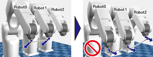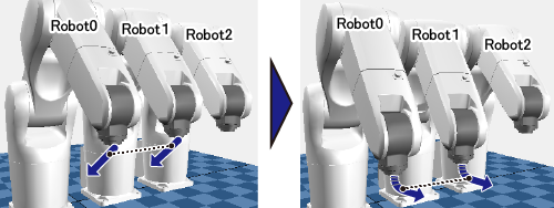 To move the first motion (performed by Robot0 and Robot1) with the Next option, move the second motion (performed by Robot2 and Robot3) with the Next option, and then start the third motion (performed by Robot0 and Robot1) with the pass motion. (The robot combination before and after the pass motion is the same.)
