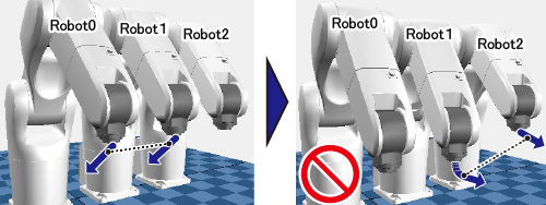 To link the first motion (performed by Robot0 and Robot1) and the second motion (performed by Robot0, Robot1, and Robot2) with the pass motion. (Three robots moves with the pass motion and the robot combination is different before and after the pass motion.)