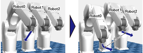 To link the first motion (performed by Robot0 and Robot1) and the second motion (performed by Robot1 and Robot2) with the pass motion. (The robot combination before and after the pass motion are different.)