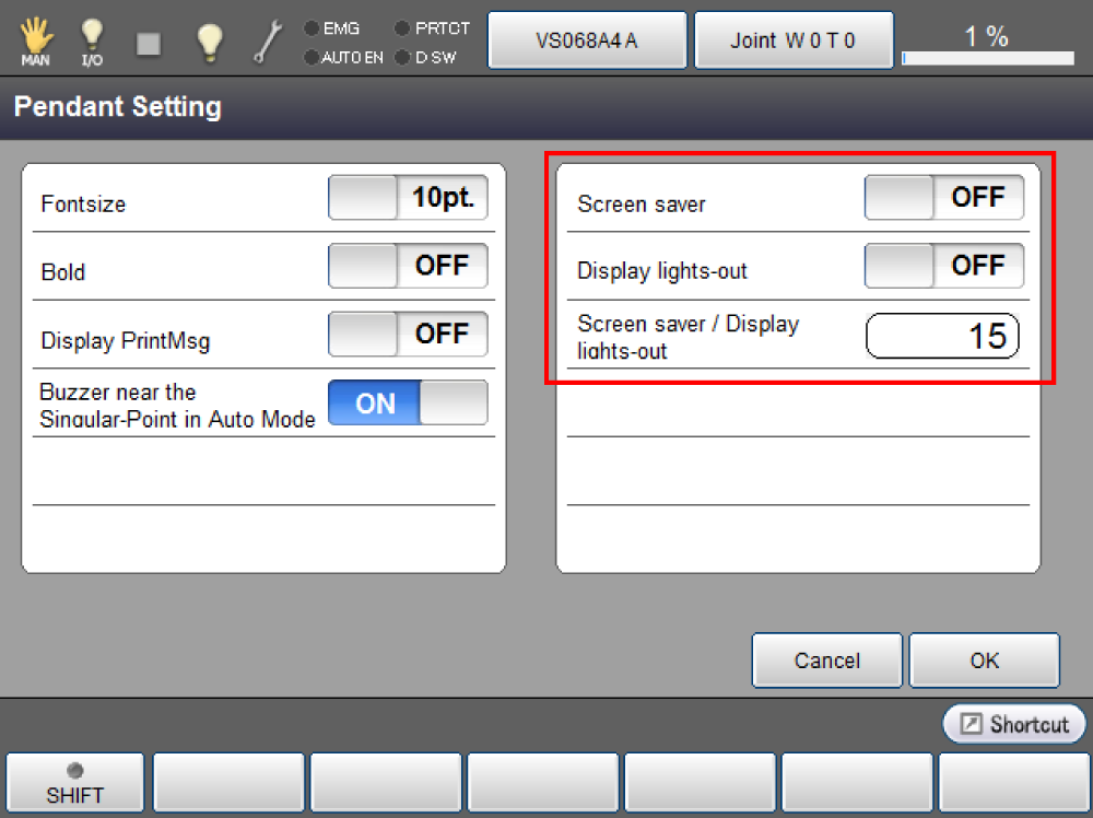 Pendant Setting window includes Screen saver and Display lights-out (to light off the teach pendant screen) functions.