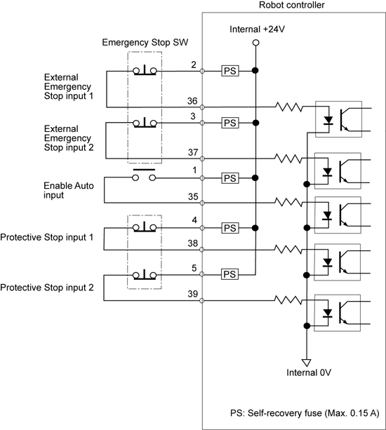 The External Emergency Stop and Enable Auto input signals are important for safety. Be sure to configure their circuits with contacts as shown below.