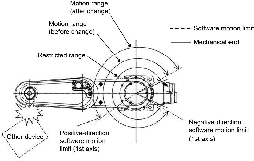 If the robot interferes with other devices or the air piping and wiring of the hand become taut as the robot arm moves, then change the software motion limits to make the motion space smaller as shown below.