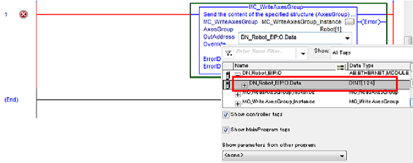 For OutAddress, specify an output tag that has been generated in EtherNet/IP communication. (In the following sample, [DN_Robot_EIP:O.Data] is selected.)