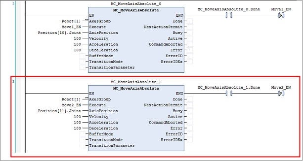 As the following shows, specifying the output variable "NextActionPermit" to the next FB's input variable "Execute" will enables a robot to move these FBs in sequence.