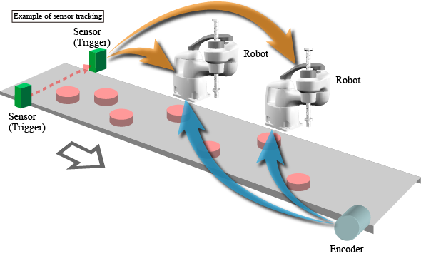 Other than the motor setting, encoder joint number, trigger setting, data registration to the tracking buffer for the conveyor must be clearly specified with the target robot number.