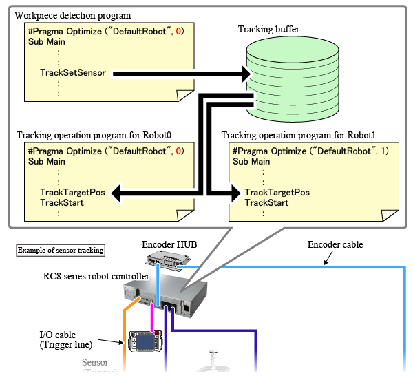 In addition to "TrackSetSensor", there are other commands that must be specified with the robot name (for example, "Robot0." and "Robot1." ). Entering robot names for each command might reduce the operation efficiency. In this case, use a preprocessor "#Pragma Optimize ("DefaultRobot", N)".