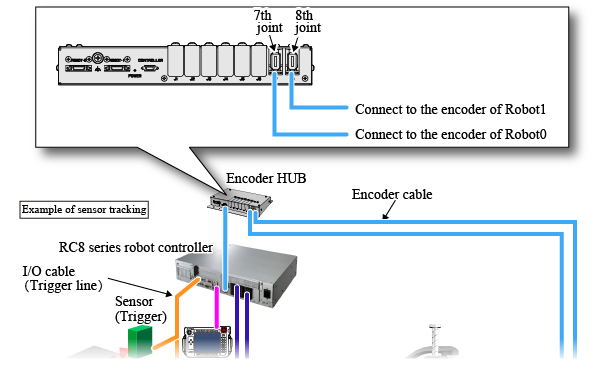 For the encoder setting and trigger setting, use a teach pendant. If the dual arm control function is used, only one teach pendant is connected. Therefore, at the configuration, you need to specify which robot (Robot0 or Robot1) is configured.